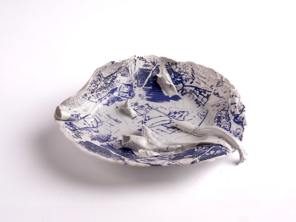 Porcelain plates taken from industrial waste of the renowned Ćmielów porcelain factory in Poland are displayed within an antique wooden vitrine, like an inherited set of dishes. The opaque black-orange, fleshy porcelain sheets conceal pre-state mappings of existing and destroyed settlements, creating a sharp dissonance with the whiteness of the plates, and illustrating the tension between memory and erasure.