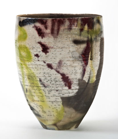 Silk print, raku firing, air brush.